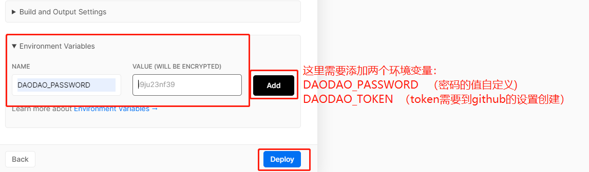 配置环境变量需要配置DAODAO_PASSWORD和DAODAO_TOKEN;DAODAO_TOKEN的获取需要到github的setting -> Developer settings -> Personal access tokens 创建,然后复制token到环境变量DAODAO_TOKEN的值上。
