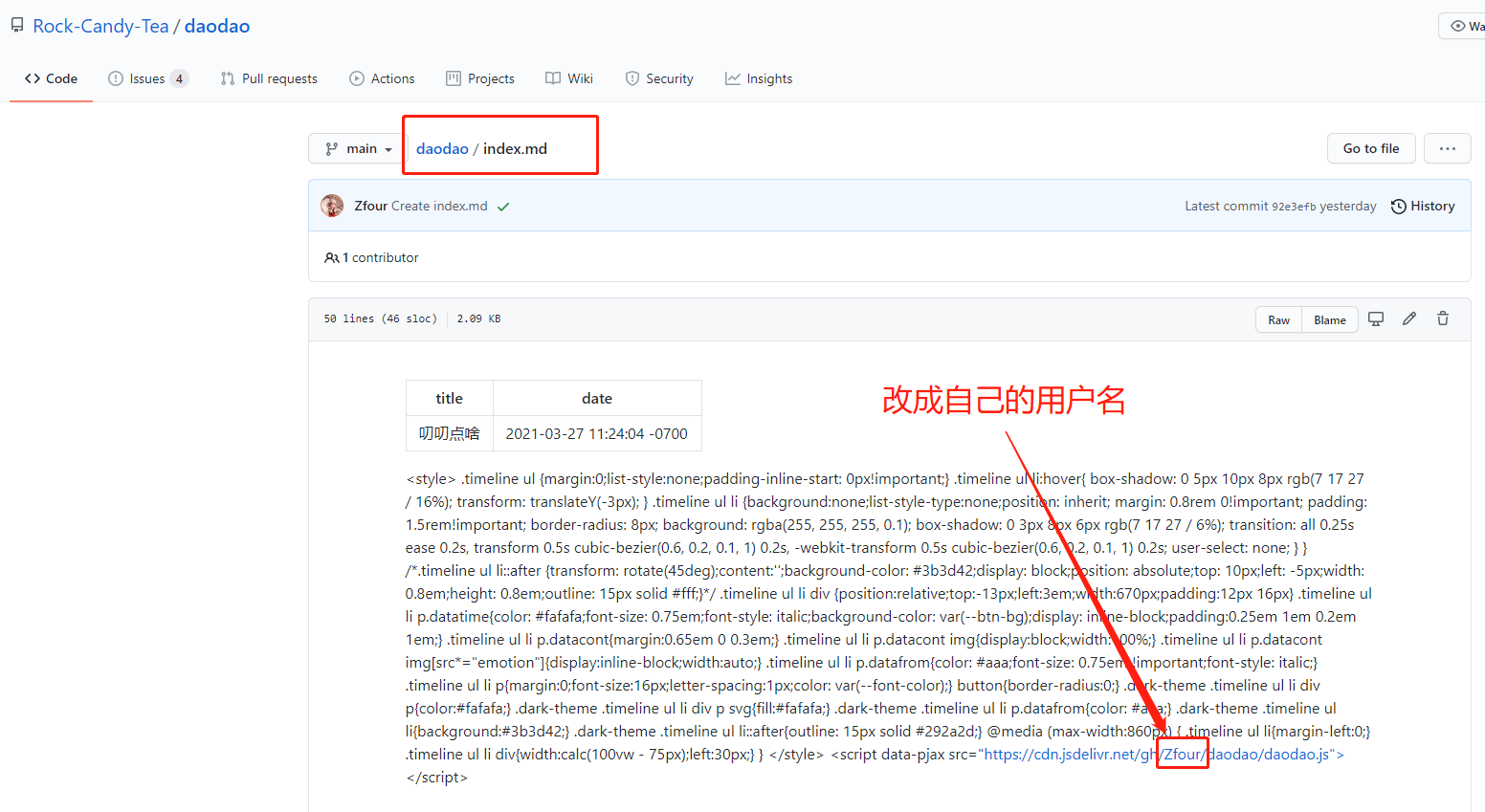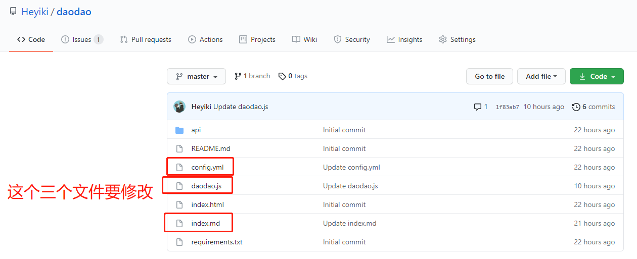 注意:这里需要三个地方,第一个就是daodao.js 第二个是config.yml 第三个是index.md ;修改的方式可以直接在github上操作,不懂的可以百度